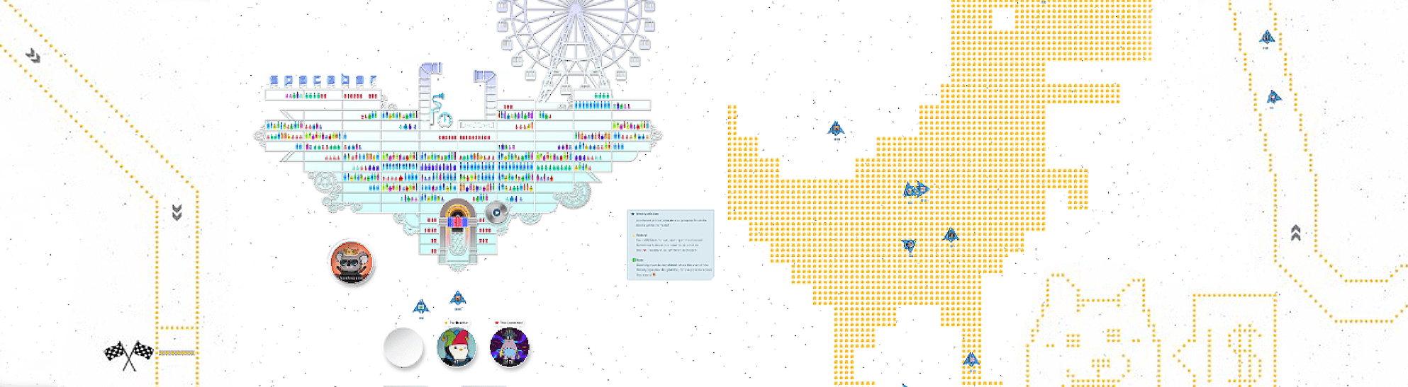 We created the ETH Universe as a digital sandbox where we could test ideas in real-time without a rigid master plan, focusing on an open world where user behavior would dictate the direction. Grounded in the Ethereum mainnet, the experience started with NFTs as onchain identity, where users connected their wallets and brought their existing PFPs into the world to serve as their presence, utilizing ERC-6551 to allow those avatars to hold ships, assets, and achievements directly. To drive daily activity, we built a resource economy based on Stars, scarce items users had to earn and spend to create Doodles, and introduced structure through Weekly Winners with titles like "The Doodle Artist," "The Committed," and "The Star Gatherer" to recognize specific behaviors.